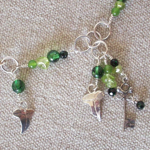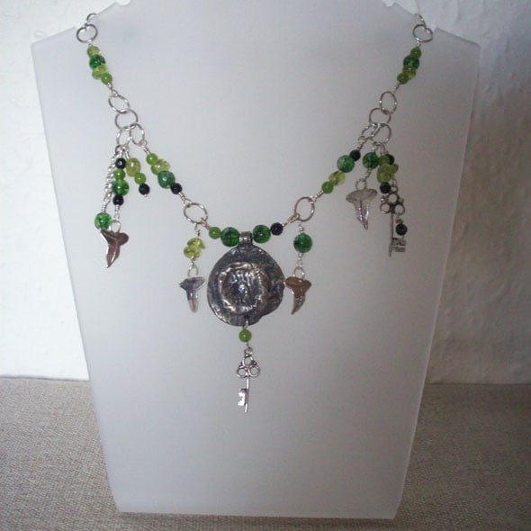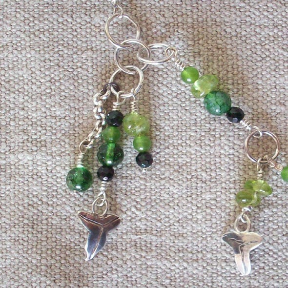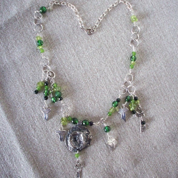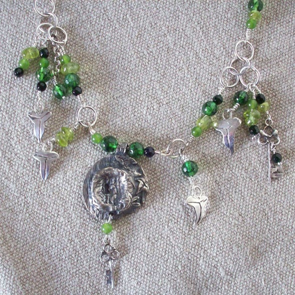 Have you ever seen those shapes in a tree, that look just like a door? Mabe on a full moon, with the right incantation, you could knock and be invited in to the fairy realm. But take care! for some have emerged 100 years later, into a changed world. No such danger here, just the enchantment of a light airy piece with a fairy tree door in 99% fine silver with handmade chain interlinked with beads of grass green peridot, dyed quartz, sparkling faceted glass and with pretty charms of sterling silver ivy leaves, keys and gemstones. All hallmarked and arrives in a gift box. I always use Special Delivery for the insurance cover it gives both buyer and seller. For non UK or multiple orders please contact me as prices vary. Thanks for looking and supporting handmade!