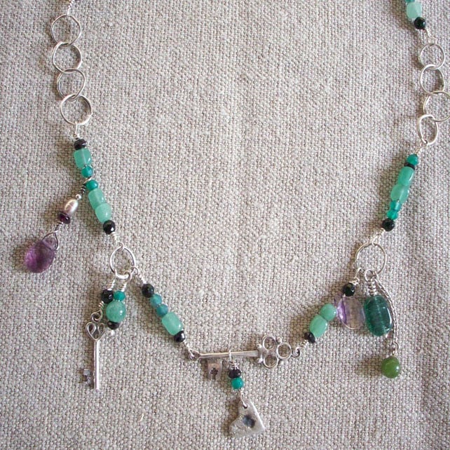 A handmade silver key forms the central link in this pretty, light airy necklace. A little 99% fine silver heart charm hangs from the key, linked with green aventurine and black tourmaline. Agates, fluorite, jade and freshwater pearl form the charms and interlinks on handmade chain. All hallmarked and arrives in a gift box. The lead-in time for this order may vary from 1 - 4 weeks as I may have one made up but in another location. Contact me for details. I always use Special Delivery for vauable items to protect both seller and buyer with insurance. Contact me for multiple items or non-UK postage as rates vary. Thanks for looking and for supporting hand-made!