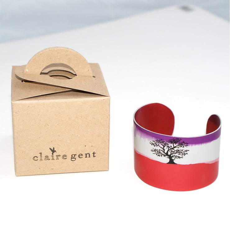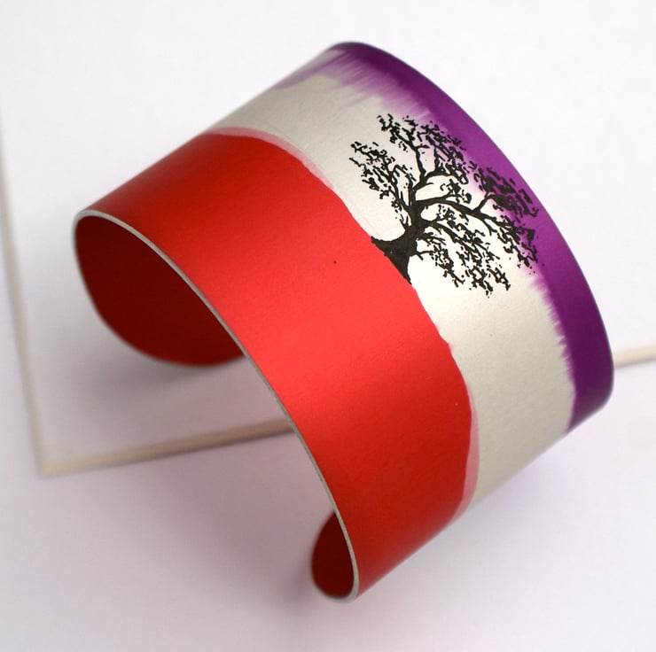 Gorgeous cuff in shades of purple and red with a black tree silhouette.
