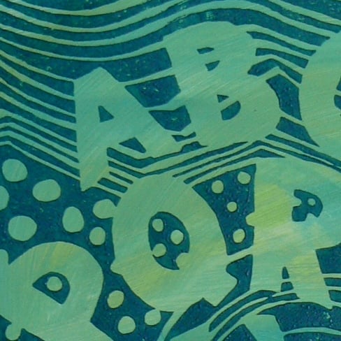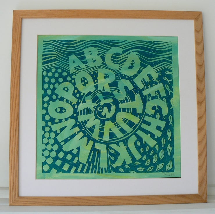 I love playing with letter forms, having begun my working life as a graphic designer, and with this alphabet I have just had fun. On this version I have first painted the paper in acrylics, to create a bright background with movement and life, before hand printing the linocut using dark blue/green ink.