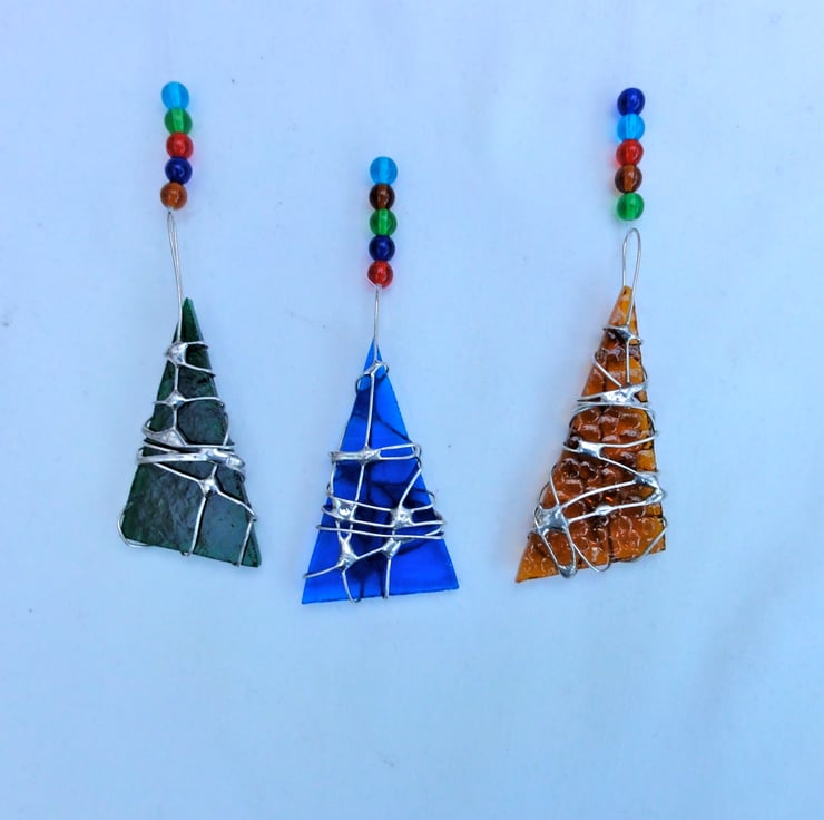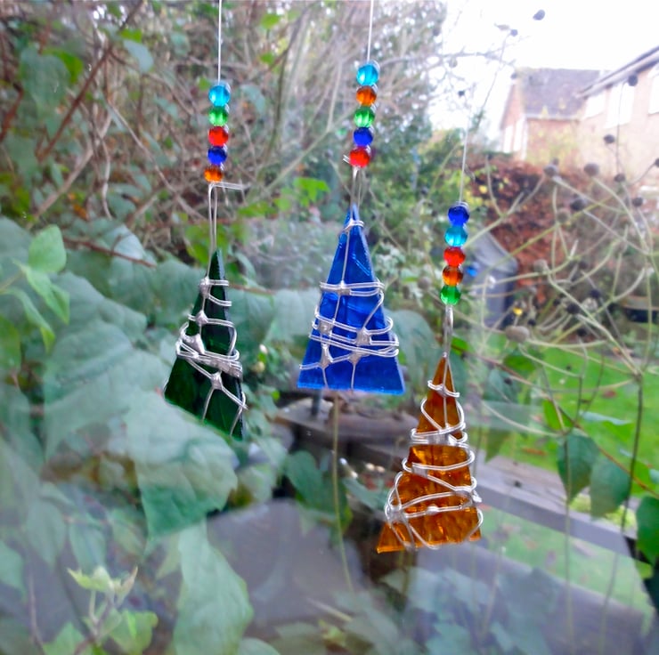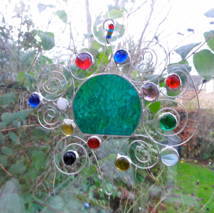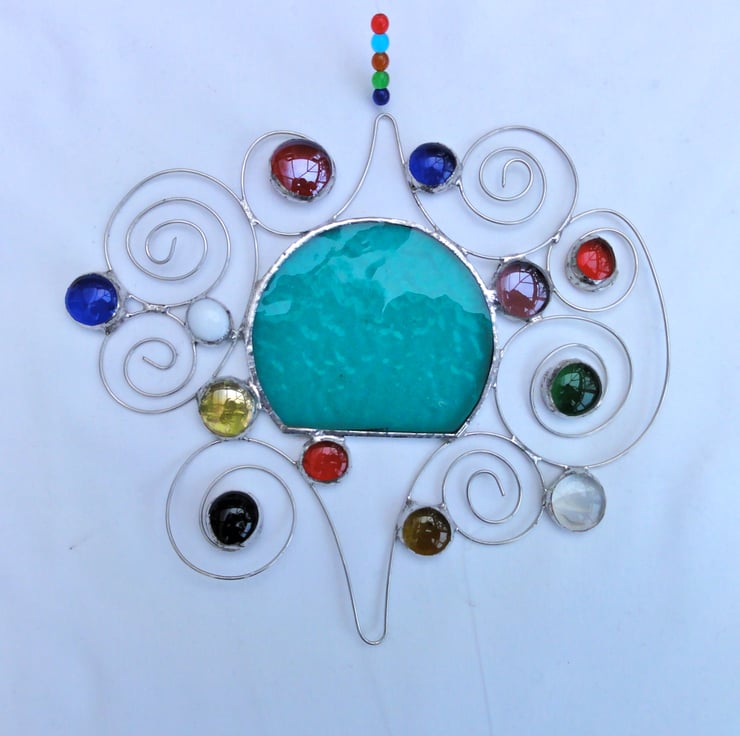 It has been made from sea green textured stained glass with a selection of coloured glass nuggets.The glass and nuggets have been copper foiled and soldered with curled wire, three triangles of glass hang from the mobile which have been wrapped with wire and soldered for added detail, each triangle hangs from a beaded length of line.