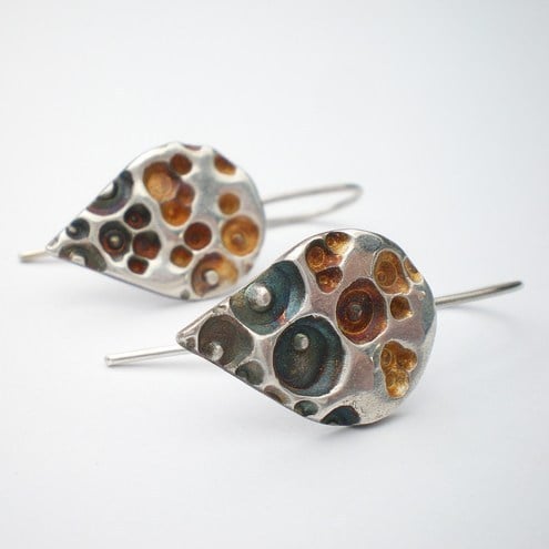 The earrings have a gorgeous enamel in purple, blue, bronze and green, this enamel is deepset within the coral texture and the remaining silver surface has been polished to a soft shine. the texture really stands out beautifully!