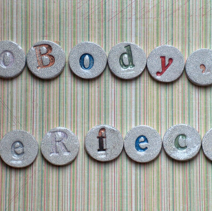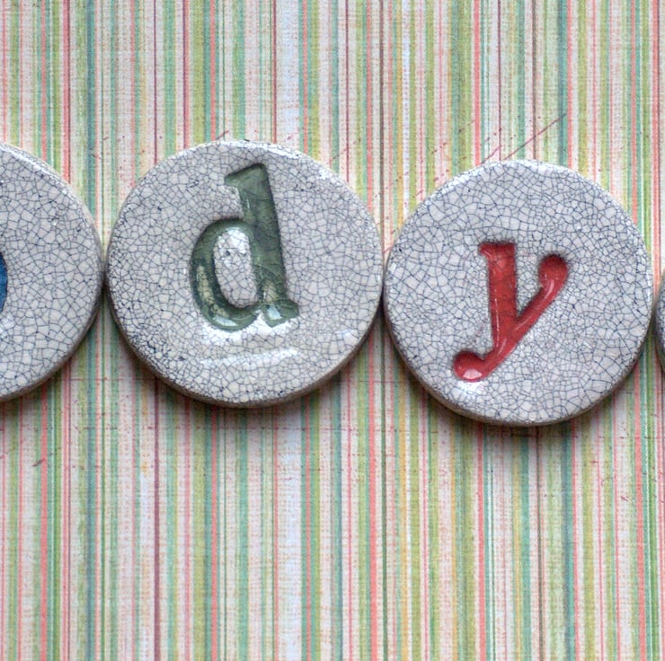Individually handmade ceramic fridge magnets, reading Nobody's Perfect'. Each letter is stamped with my vintage stamps, and coloured using lovely coloured under glaze, then finished in my trade mark crackle glaze. The magnets come packaged in a vintage style paper backing and protected in a cellophane packet.