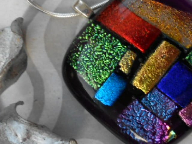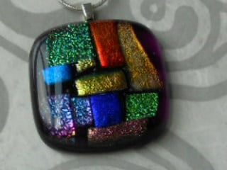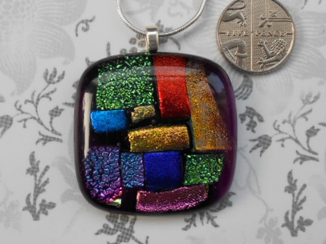 Fused glass pendant in different coloured pieces of dichroic glass on a deep purple background. Pendant measures approximately 3.5cm x 3.5cm x 0.5cm excluding silver plated bail. It hangs on a 40cm (16in) silver plated snake chain and will arrive wrapped in tissue in a pretty organza bag.