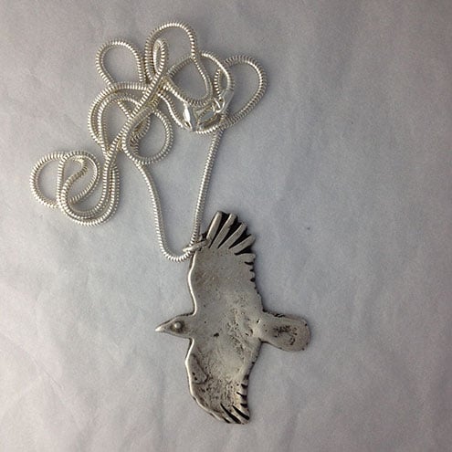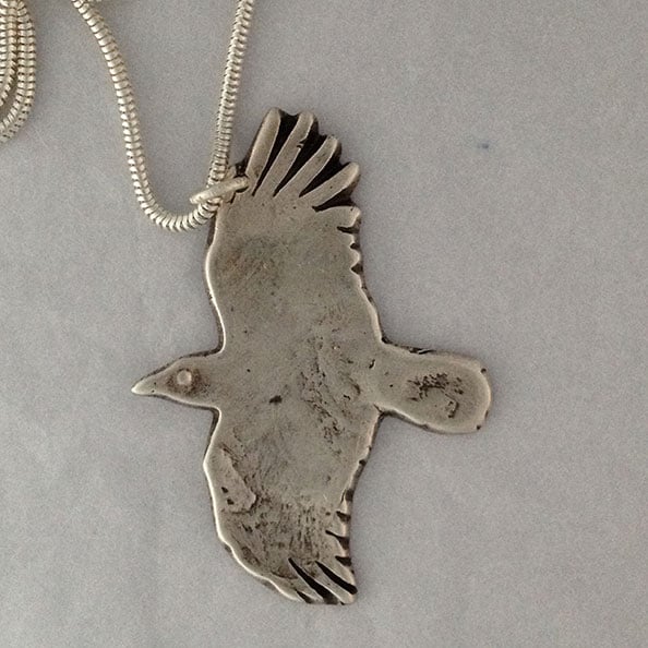 Sleek fine silver crow in flight. This fine silver crow flys on an 18" sterling silver snake chain. He soars on the winds and spills the air from beneath his wings to land.