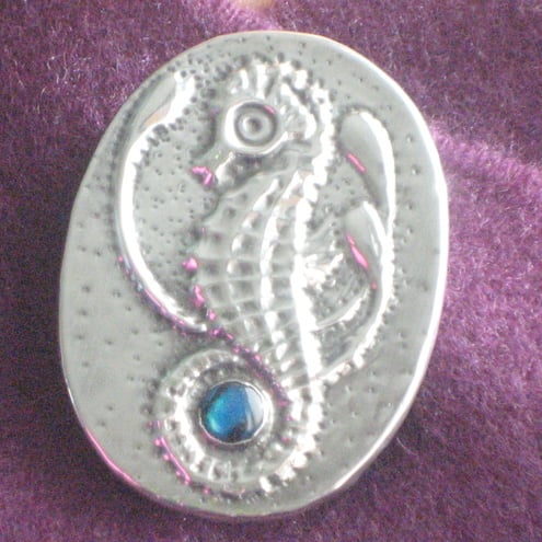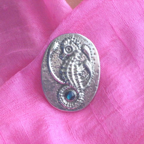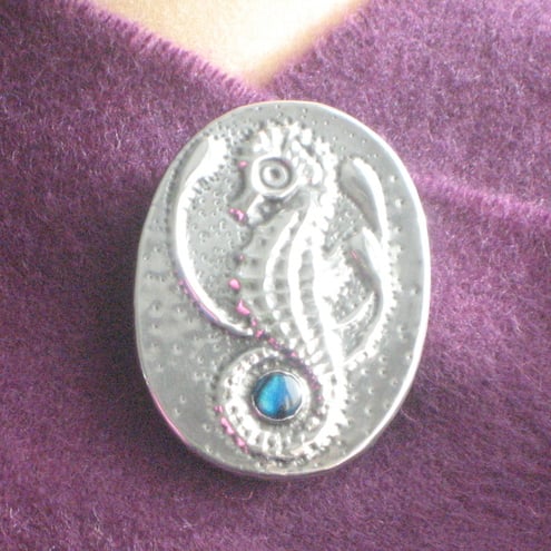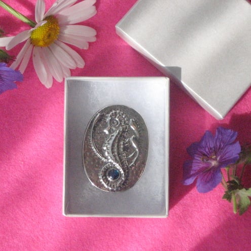 This brooch has been individually hand-made in shiny lead-free pewter, and measures 45 x 34mm.It features a blue paua shell cabochon. It has a 25mm pin with safety catch on the reverse, and comes in an attractive gift box.