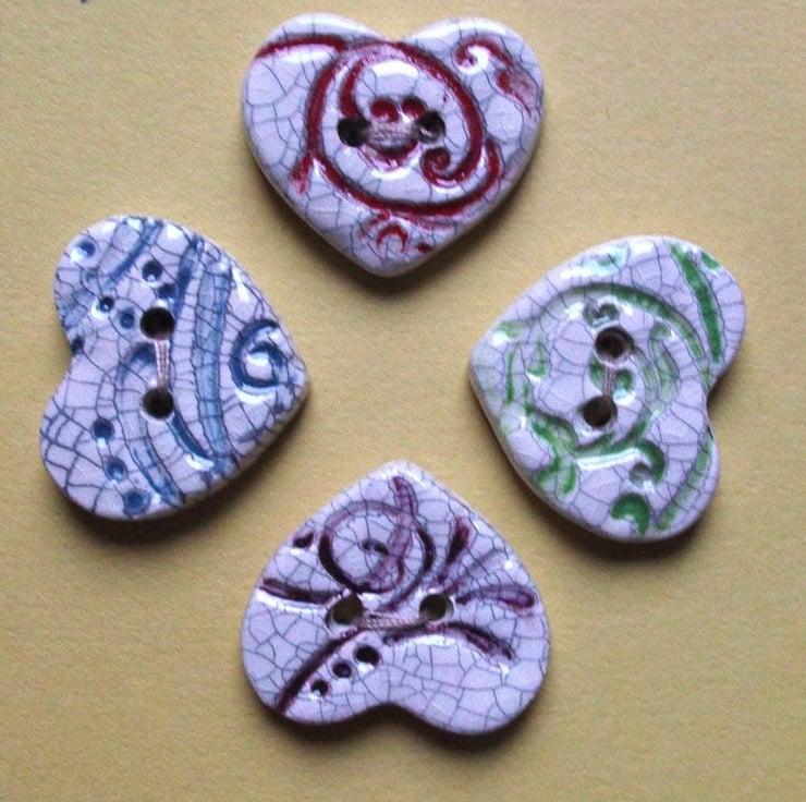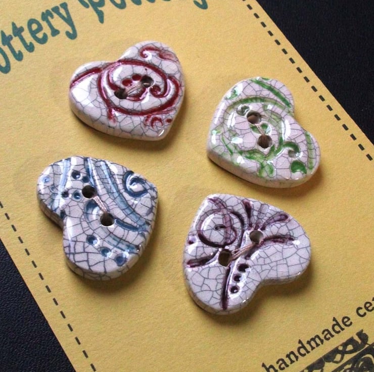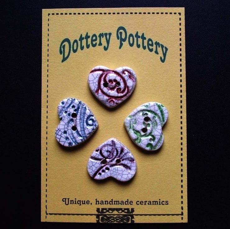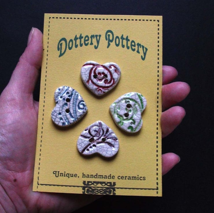 These cute little buttons are made from white earthenware clay, embossed with a pattern and coloured.