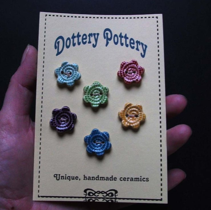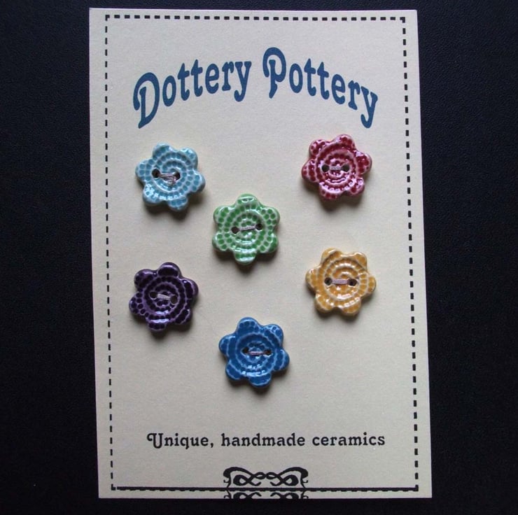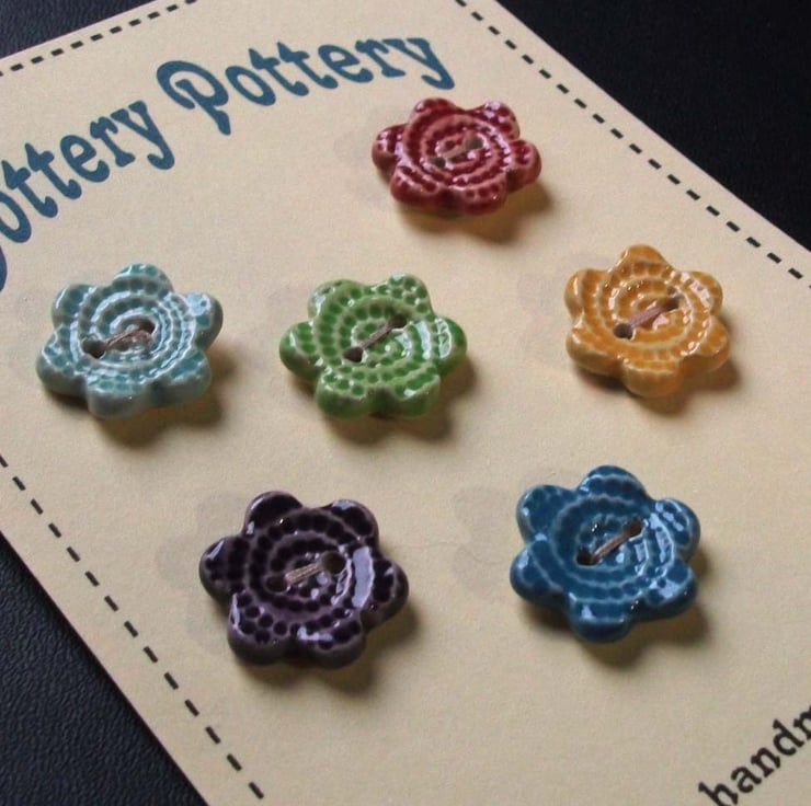 These bright little swirly flower buttons are made from white earthenware clay and measure 1.5cm diameter 4mm deep.