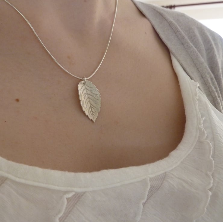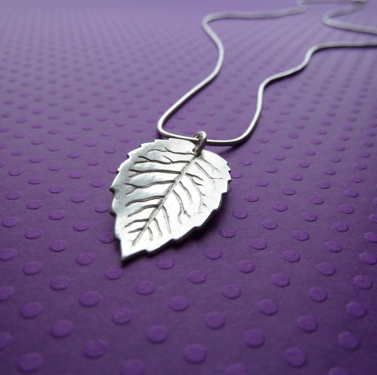 This simple, elegant leaf pendant is formed from 99.9% silver. 99.9% silver or fine silver is less susceptible to tarnishing than sterling silver. My leaf pendants are crafted using silver clay. Silver clay is made up of tiny particles of recycled silver held together by an organic binder. When fired the binder burns away to leave the finished fine silver pendant.