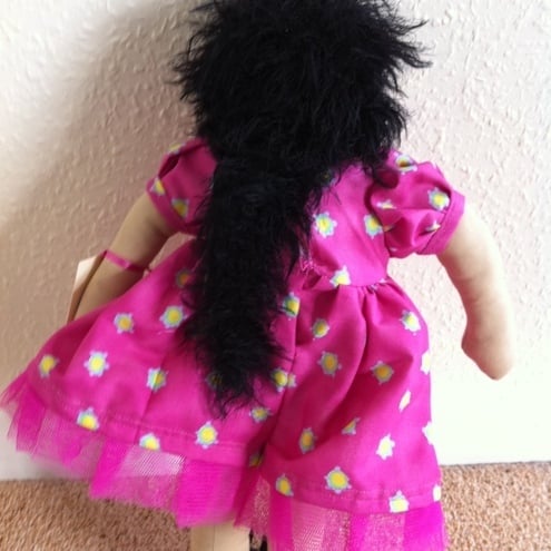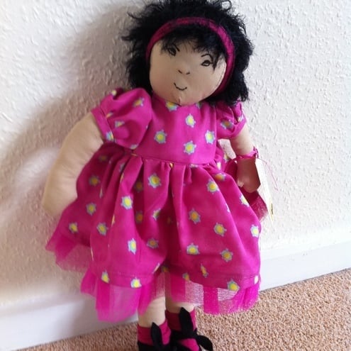 Zozi is 42 cm tall and has long black hair. She is wearing a bright pink full skirted cotton dress trimmed at the hem with a pink net frill. She has bright pink socks, pants and headband and black tie shoes. Zozi comes in a jute carry bag.