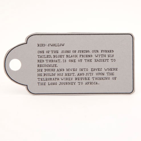 They come in a grey/black jewellery box made from recycled cardboard. With a handmade tag with information about the bird.