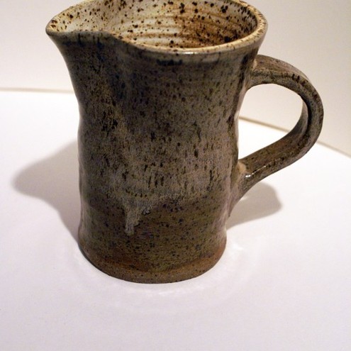 A hand thrown milk jug with a rustic look glazed in rutile and a white and oatmeal milk jug.
