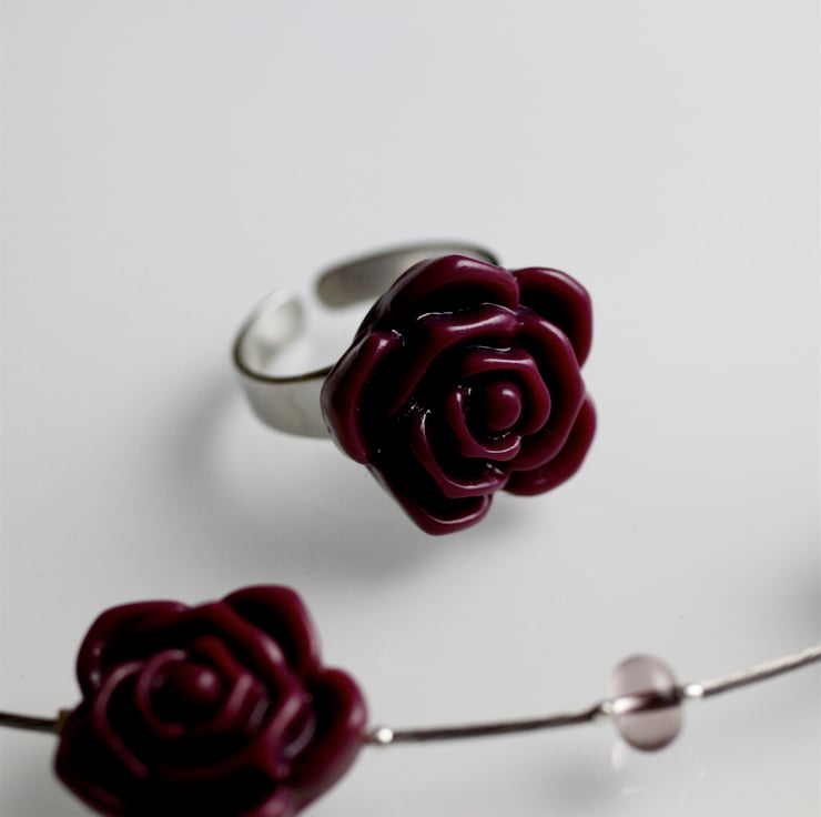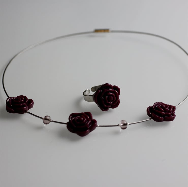 The necklace is accompanied by a ring with the same flower. The necklace is approx 44 cm in length with a silver plated swivel clasp and the ring is adjustable and made from silver plate.