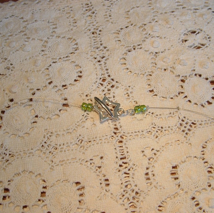 A necklace of green with black dot lampworked beads. Silver plated star shaped clasp.