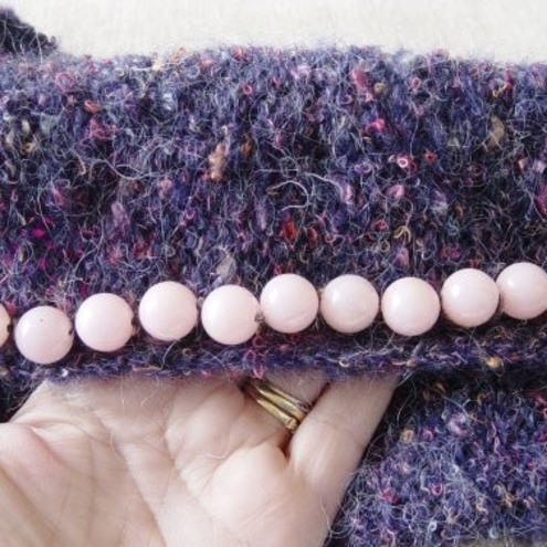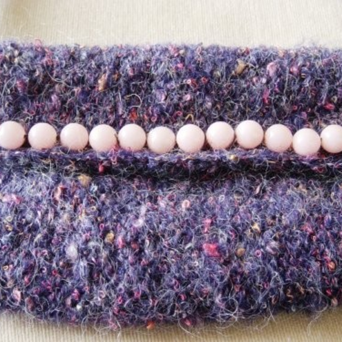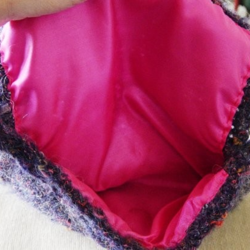 Purple & Shocking Pink Delight! Is a cute Hand knitted, crocheted & fully lined handbag, with a crocheted handle strap & short flap over top, made from a multi-coloured Mohair mix yarn & completed with a shocking pink satin style lining and with a row of 14 baby pink round lucite beads.