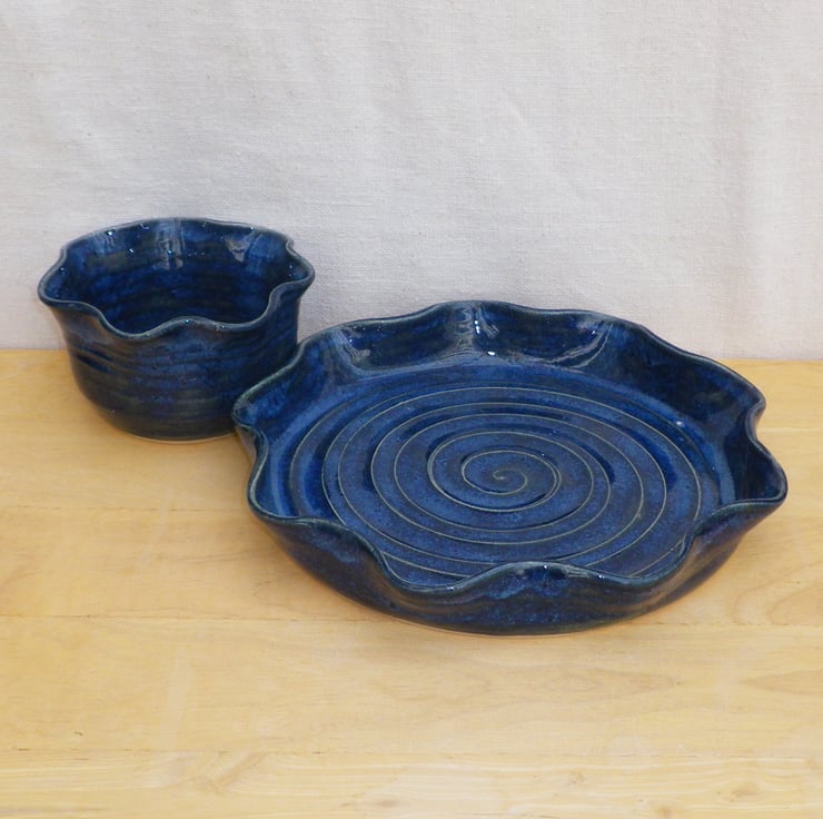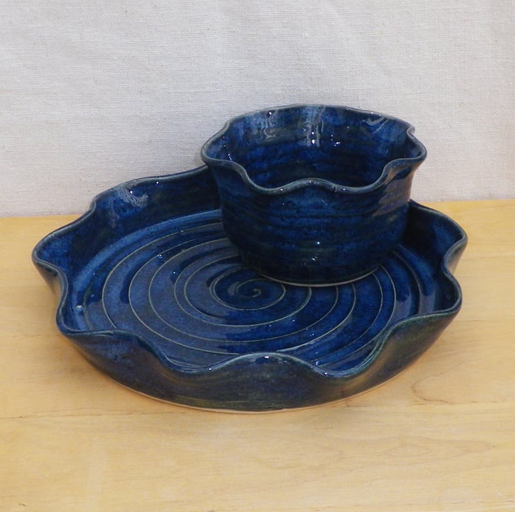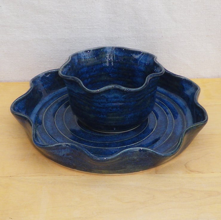 This chip and dip set was thrown by me on my potter's wheel using strong white stoneware clay.