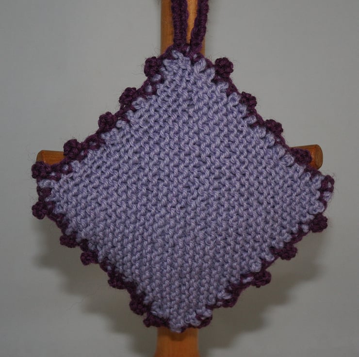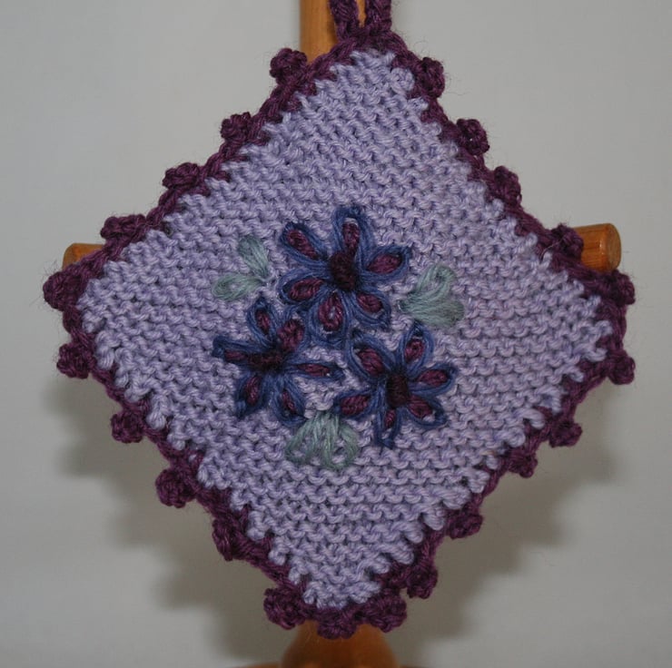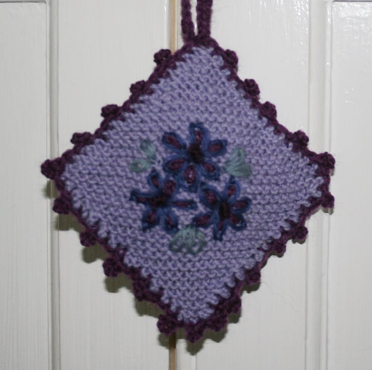 A simple knitted sachet, in a lovely 4-ply wool blend yarn, with crocheted picot edging and a simple hand-embroidered flower motif - gently filled with about 6 teaspoons of lavender. A crocheted hanging loop is worked into the edging.