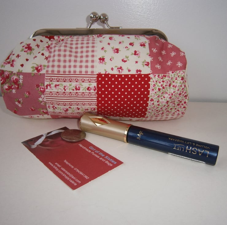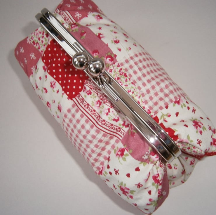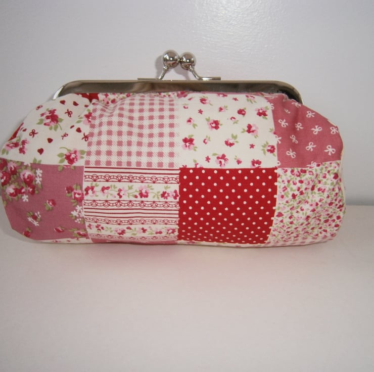 Perfect little clutch for your mobile phone, keys, sunglasses,change and credit cards or even a make-up bag. Pretty pink shabby chic fabric with contrasting lining, padding and metal frame clasp.