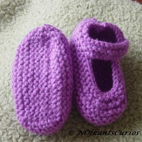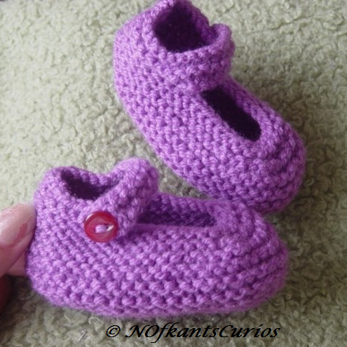 Precious Purple, hand knitted baby girls shoes, with single button strap.