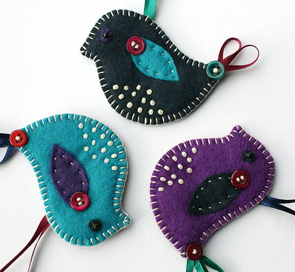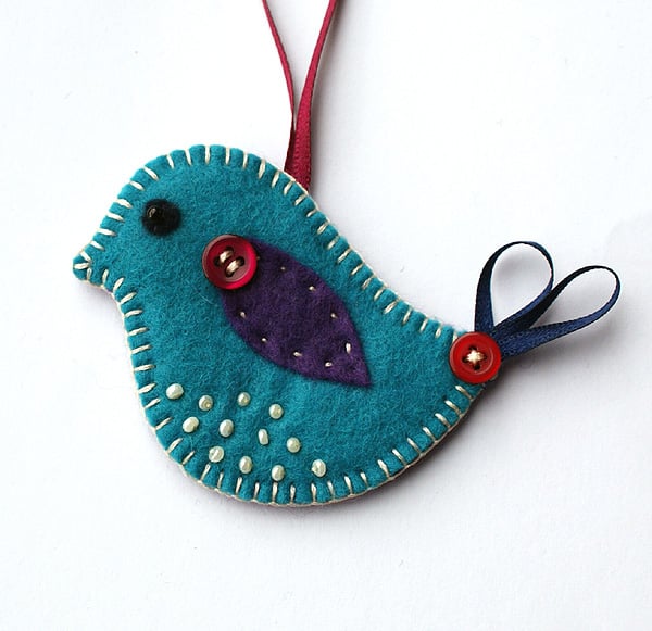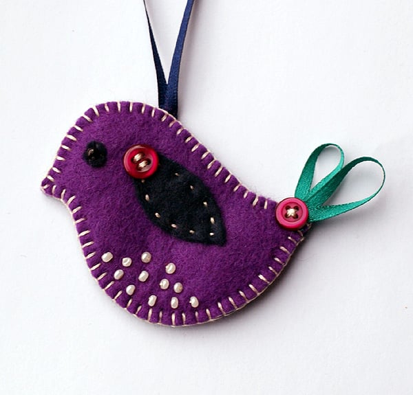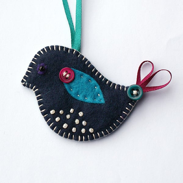 The three birds are in coordinating colours of midnight blue, turquoise and purple. They feature little beaded eyes, stitched felt wings and beaded bellies and are finished with pretty ribbon and button tails.