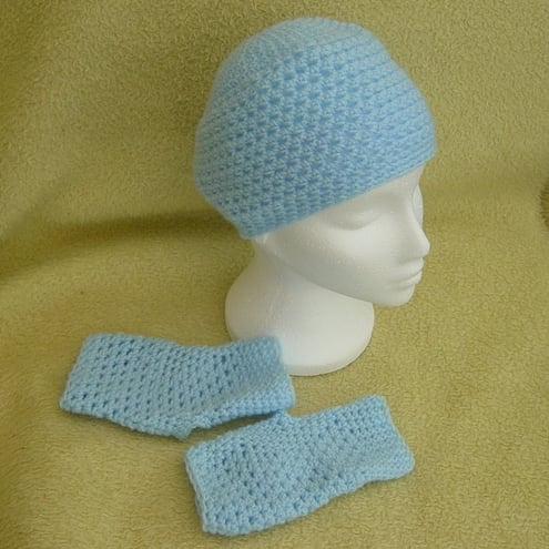 Crocheted in a pretty pale baby blue wool blend yarn which also coordinates with a Slouchy hat listed separately, and if both items are bought together, £2.00 will be refunded through paypal, from the combined price.