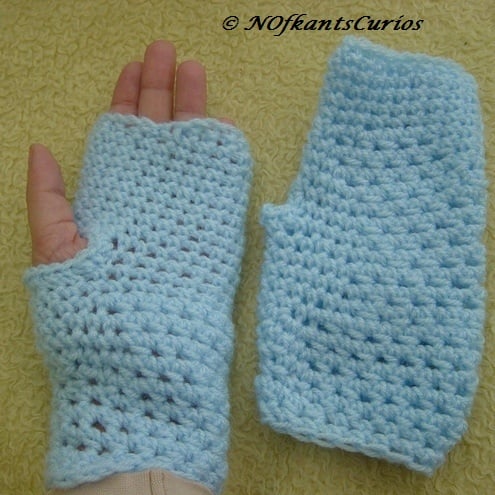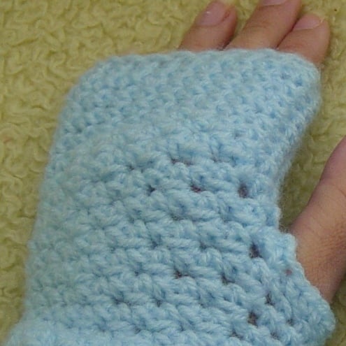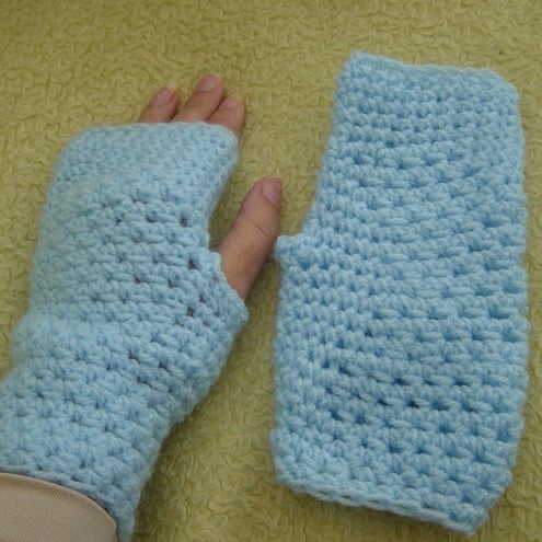 A pretty pale baby blue pair of Fingerless mittens are a pair of crocheted accessories to keep your hands and wrists warm, cosy and stylish!