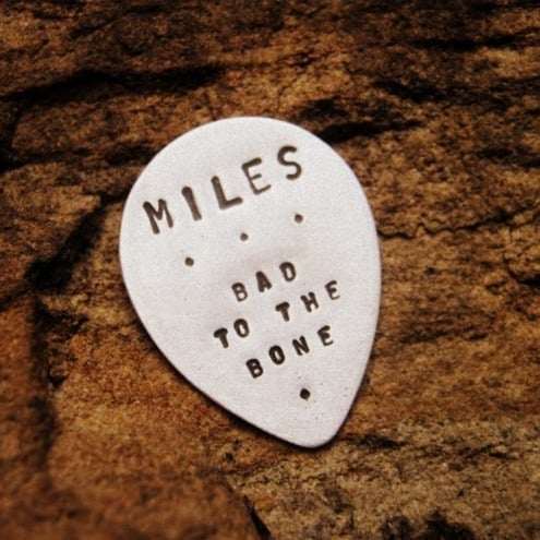 A brand new addition to my shop - sterling silver guitar plectrums, hand stamped letter-by-letter with you chosen words, names, lyrics or dates.