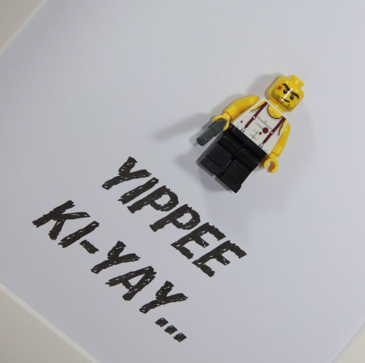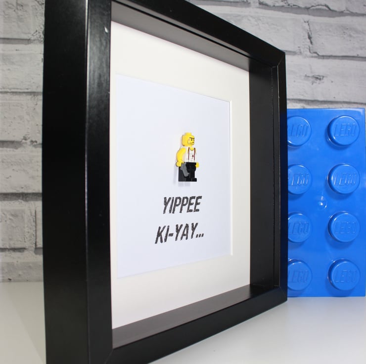 Our little action hero has been mounted in a deep box frame and underneath we have printed "Yippee Ki-yay..." perfectly capturing his most famous line.