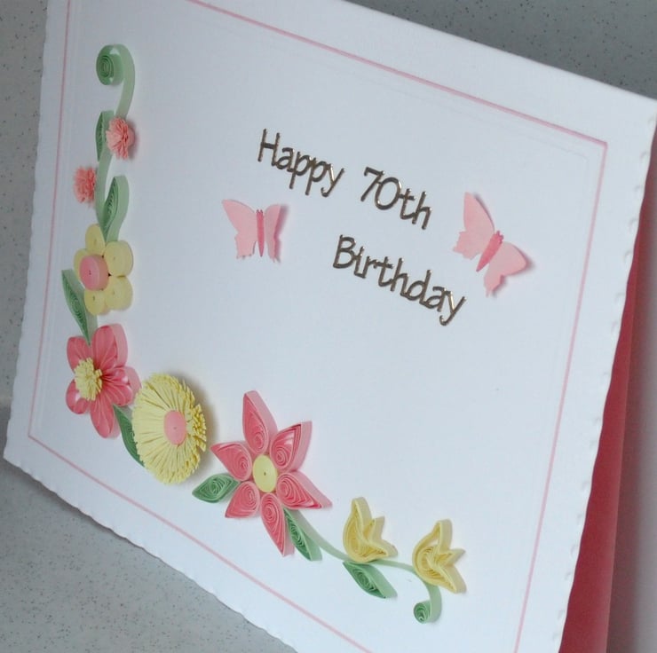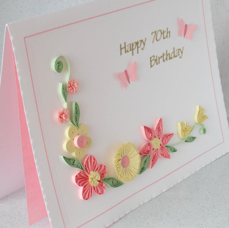 A beautiful handmade quilled 70th birthday card with quilling flowers in pretty shades of pink and lemon for a very special person.