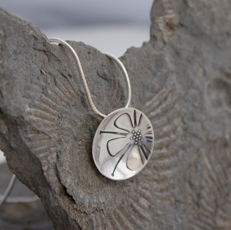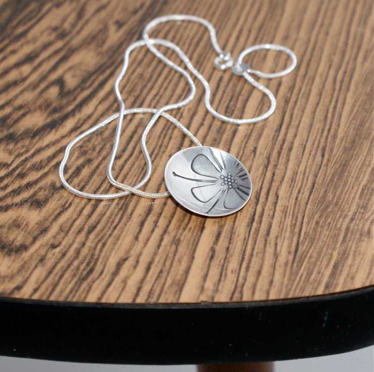 Cute domed disc with embossed flower hand made in sterling silver hung from a sterling silver 16 snake chain.