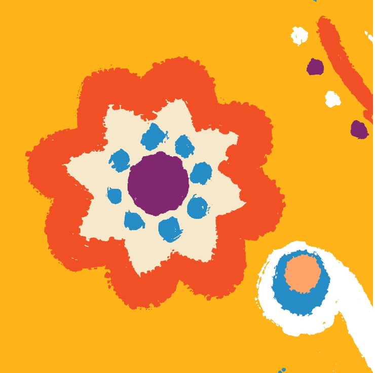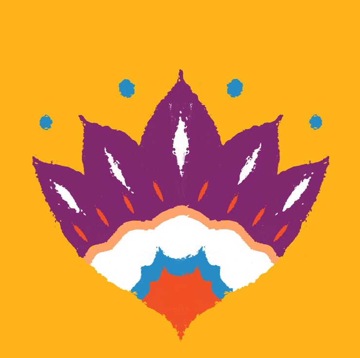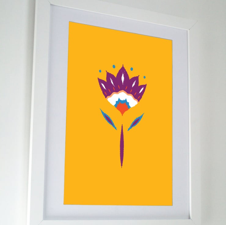 A colourful, modern yet traditional design inspired by the 19th Century Swedish Kurbit folk art motif, created using the ink blot method of printing alongside modern Photoshop techniques.