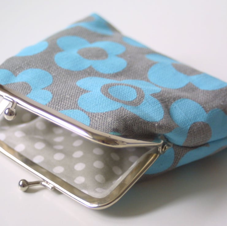Lined in pale grey and white spot fabric and finished with an antique finish frame. The purse has an inner lining between the two fabrics giving it extra body and a nice squishy feel.