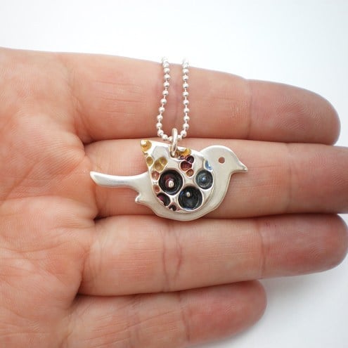 Cute silver bird pendant with a spotty texture wing. Inspired by nature and made from recycled silver he makes a great eco friendly choice!