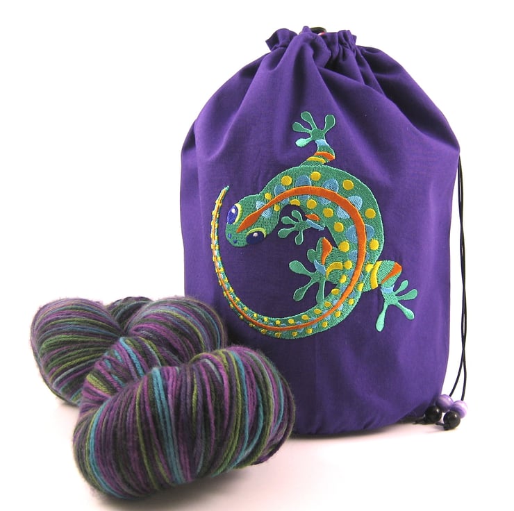 The third picture shows a bag alongside a 100g skein of sock yarn for scale purposes only. Please note that this listing is just for a project bag.