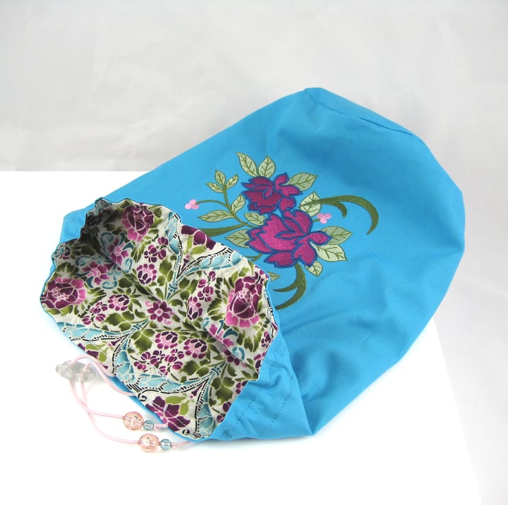 The bag will be the same style and size as those shown in the third and fourth pictures, except that it will be embroidered as in the main picture and lined with the fabric in the second picture.