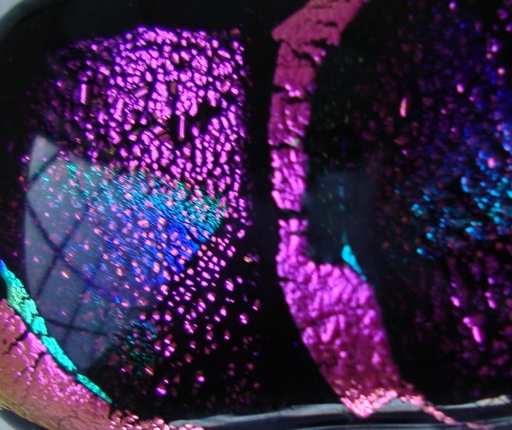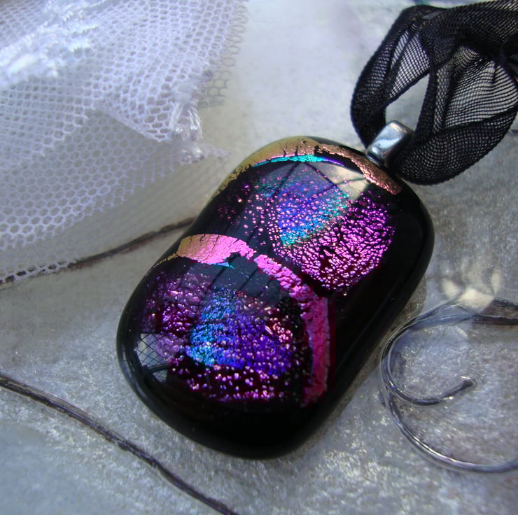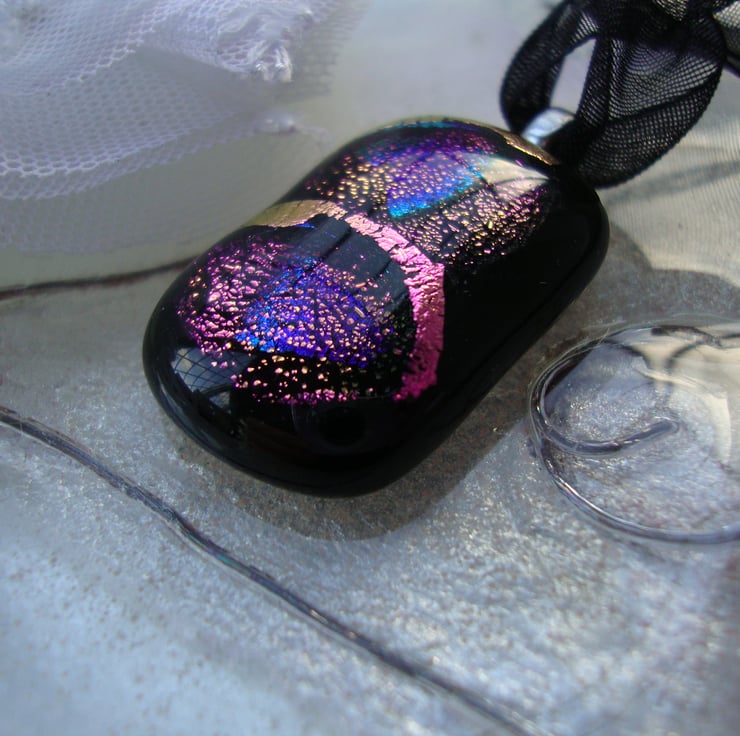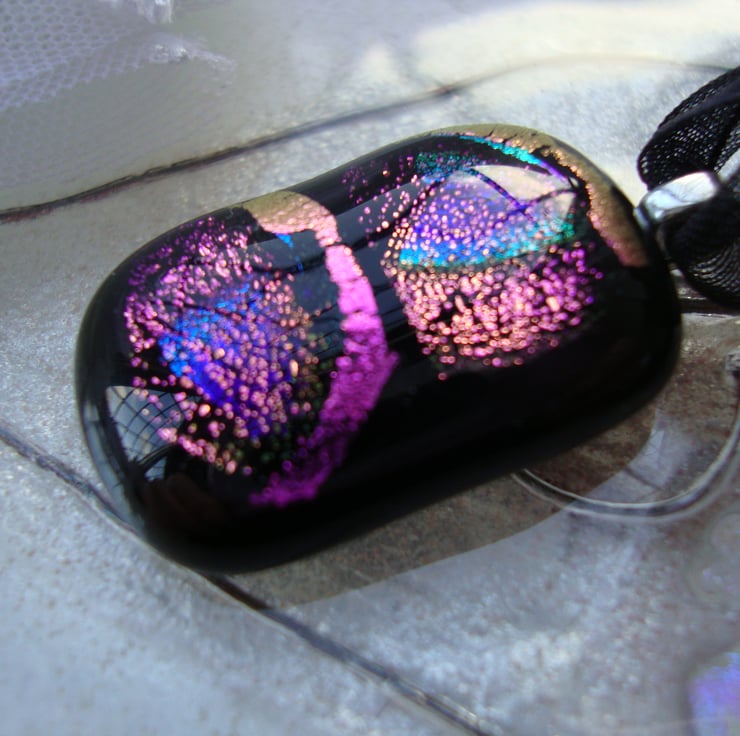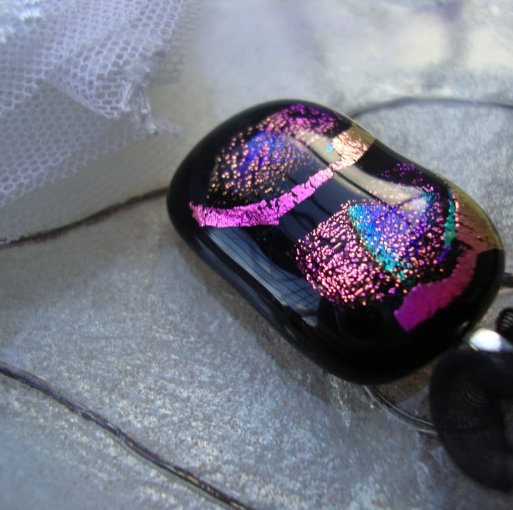 stunning dichroic jewel colours on a jet black background make this a beautiful pendant.