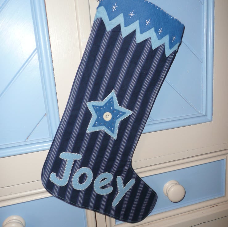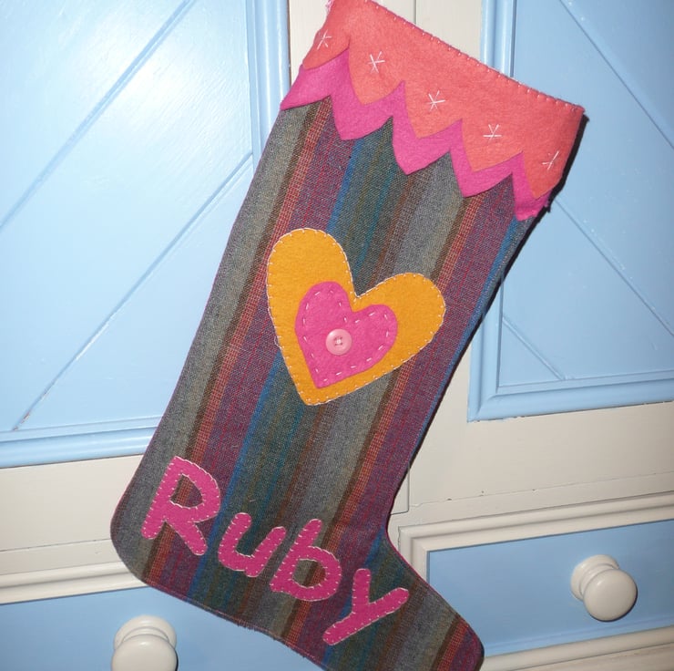'Twas the night before Christmas....' . Hand made from vintage and recycled fabrics and felt in your choice of colours, each stocking is unique. Decorated with appliqued and embroidered felt shapes, and a name, they will be treasured for years to come. Stockings measure approx 42cms long, 16cms wide and 30cms at the foot. Sizes can be altered - just email with the required name and any other requirements. (Because these are made to order and unique, they may take a couple of days longer to send out at busy times.)