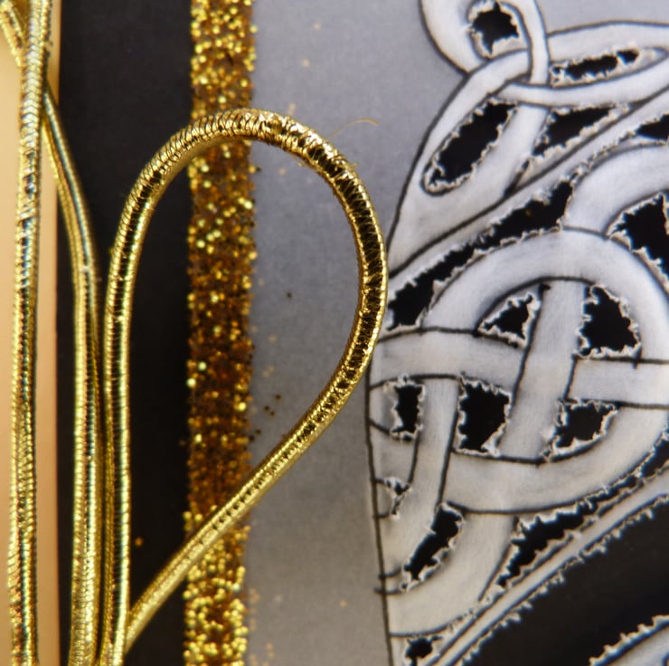 Traditional design Celtic bell embossed and perforated onto parchment. Embellished with fine gold glitter and gold rope cord bow. Mounted onto black card and mounted again onto gold card for a really dramatic effect. Beige parchment paper insert left blank for your own message. Supplied with quality whie envelope. Cello wrap.