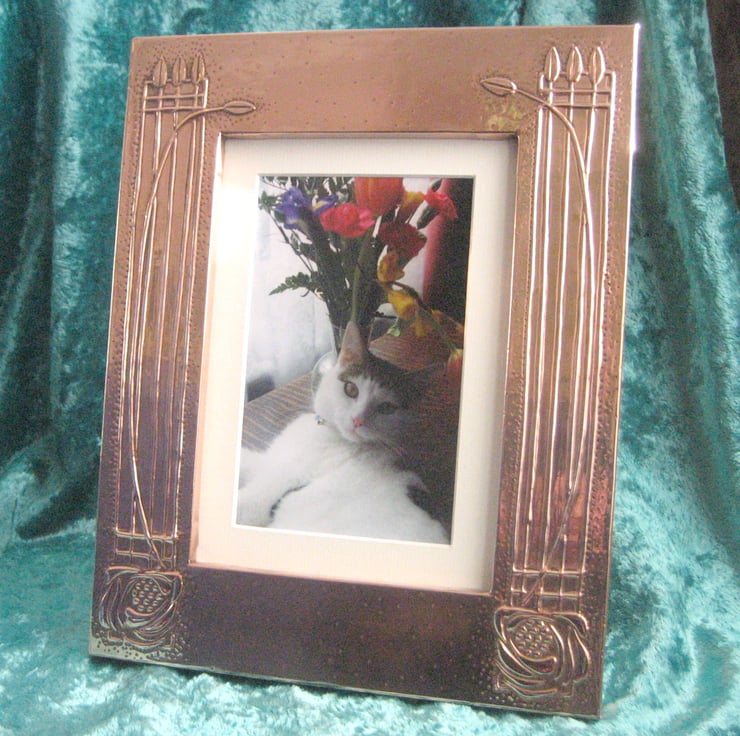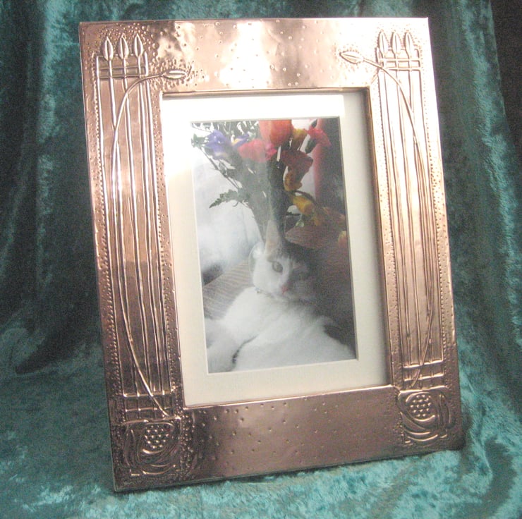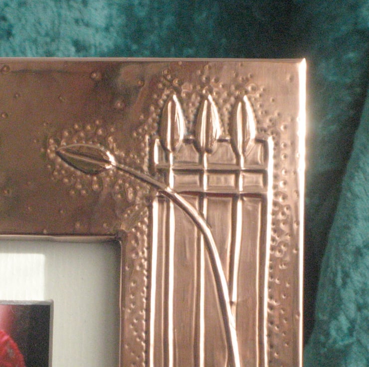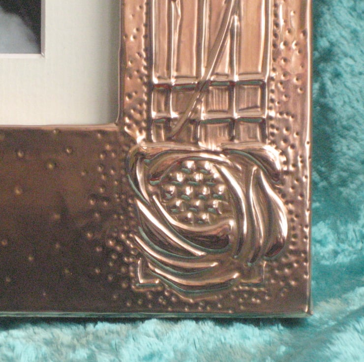 This frame has been hand-made in copper in the Arts and Crafts tradition. The design comprises elements of the work of Charles Rennie Mackintosh and the copper has been patinated and polished to a rich finish.