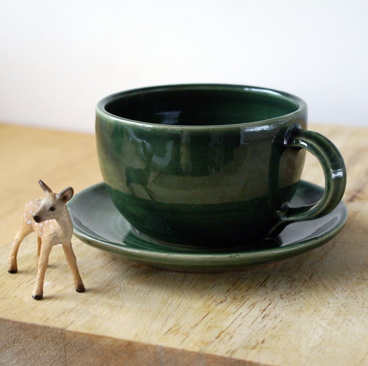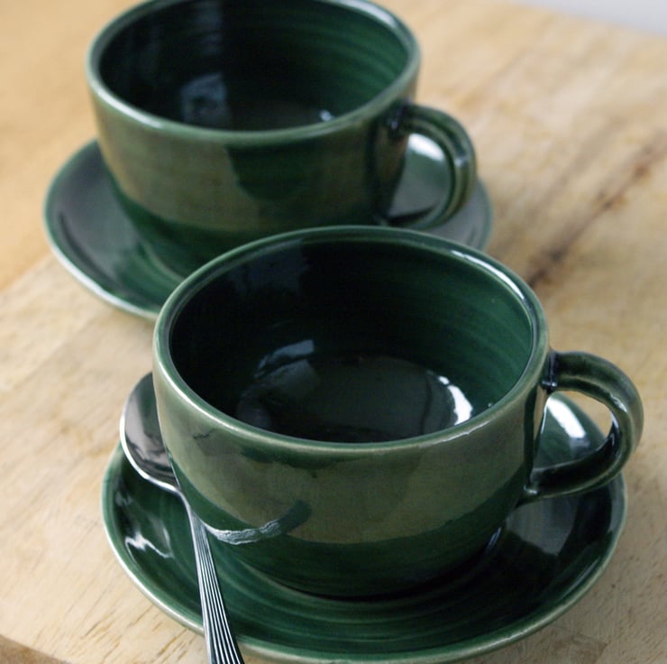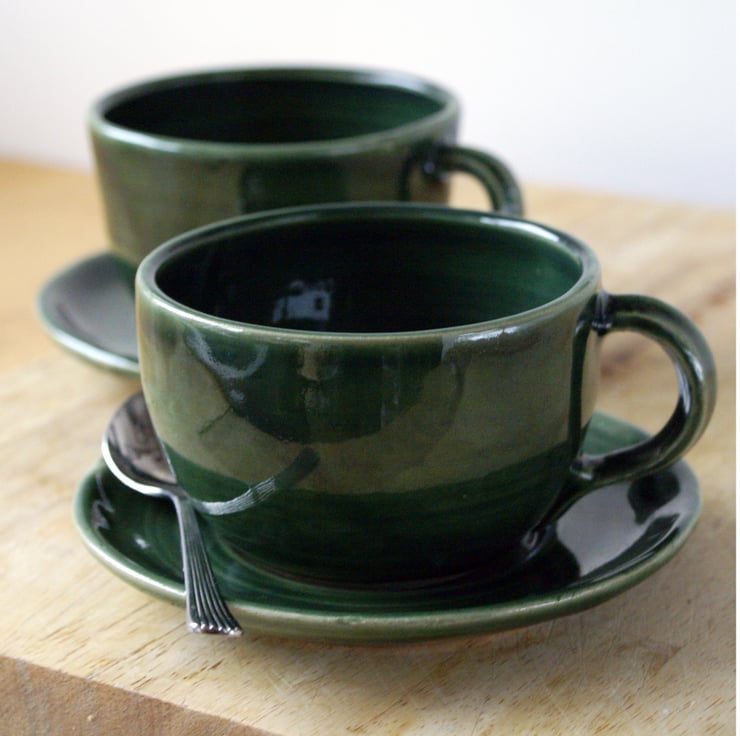 Two hand thrown cappuccino cups with saucers glazed in forest green. Handmade Stoneware Pottery by littlewrenpottery on Folksy.