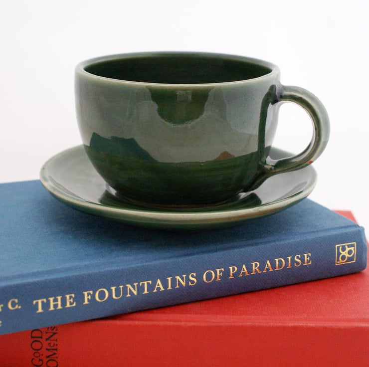Throwing rings remain on each piece giving a gentle texture where my hands have drawn the clay upwards. The set also comes with two matching green saucers, each one is gently curled to rest your spoon upon or have a sneaky biscuit!
