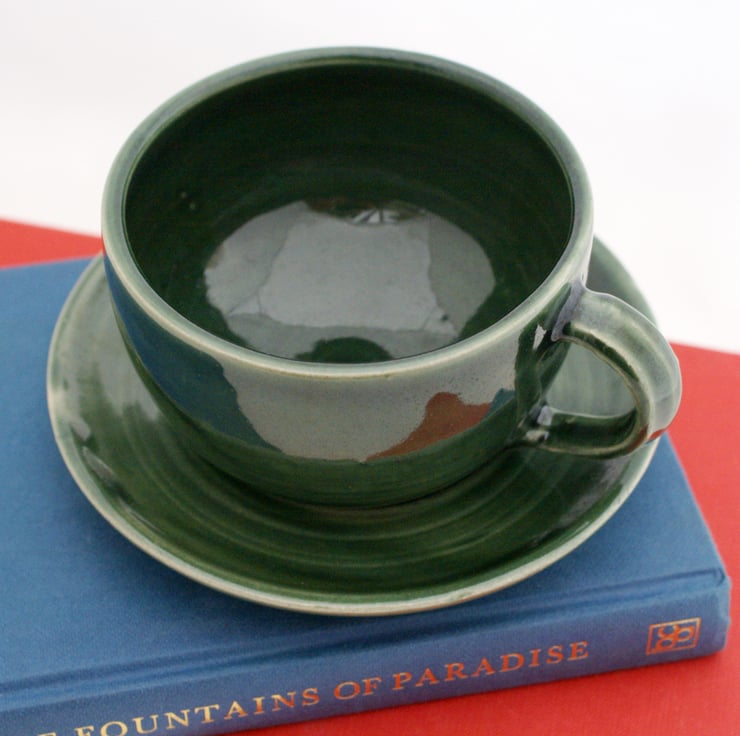 Each cup was hand thrown on my potters wheel from British white stoneware clay and glazed in forest green which has beautiful glossy finish. They feature round curvy shape, a gently beveled drinking edge and sturdy pulled handle to support the weight of the cup when filled.