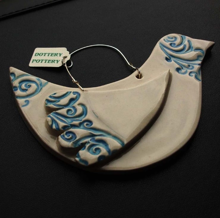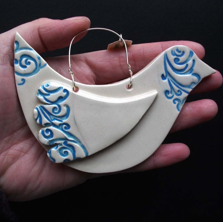 This simply elegant bird decoration is hand cut from white earthenware clay and decorated with an embossed swirl. It is then twice fired to a top temperature of 1100 degrees so it is nice and strong.