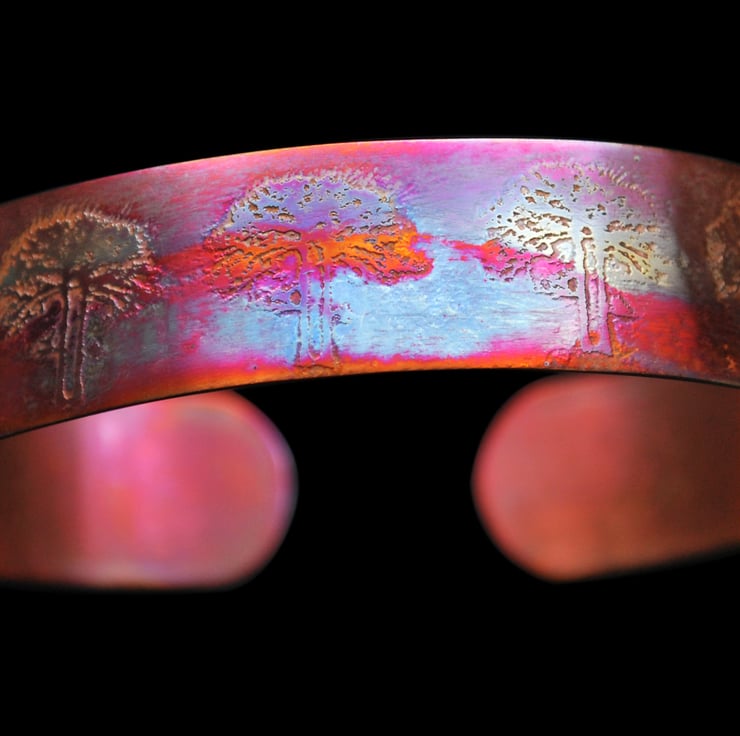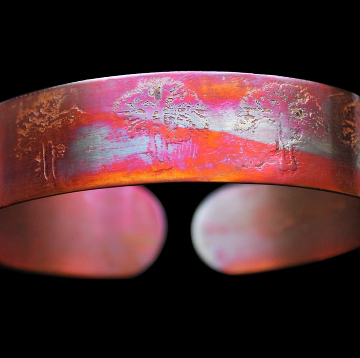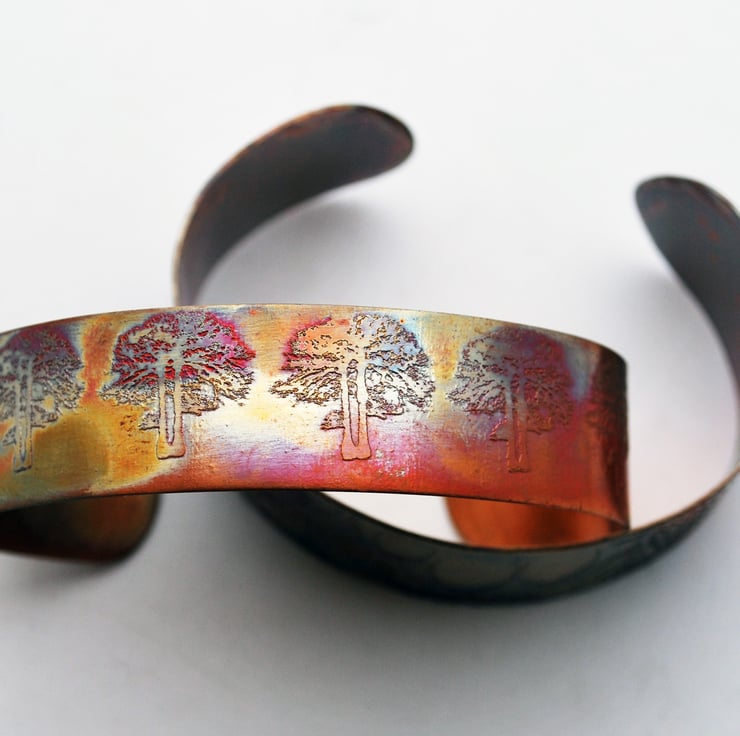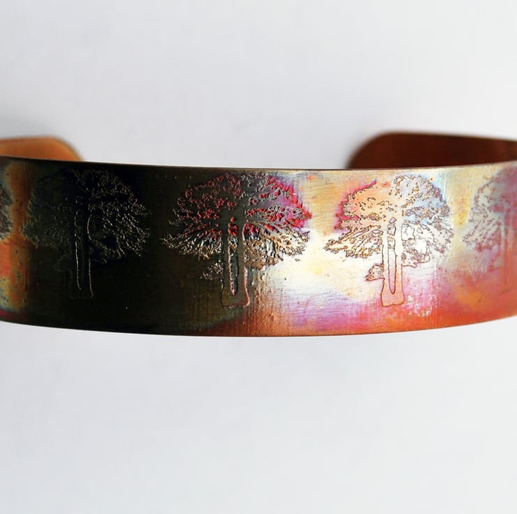 This etched copper bangle bearing imagery of trees has been heat treated to create a vibrant multicoloured patina: this will deepen over time. I have developed a technique of literally 'painting' with a flame to manipulate the shape and direction of the colours. Although there is a degree of control, each piece is unique, as the colour patina cannot be replicated exactly.