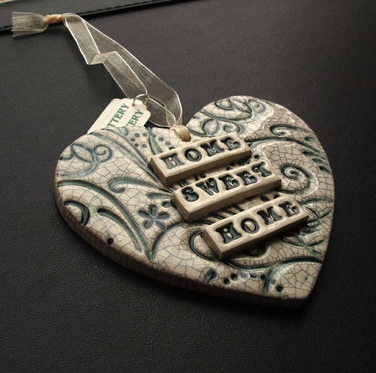 This ceramic heart is made from white earthenware clay and decorated with the words,home sweet home. It has a green swirly background finished off with a crackle glaze for a shabby chic look.