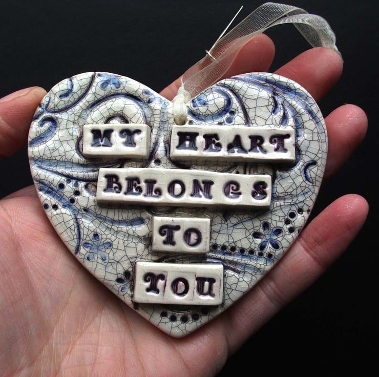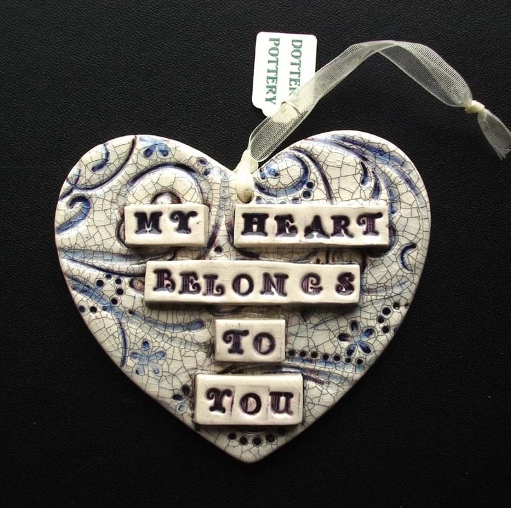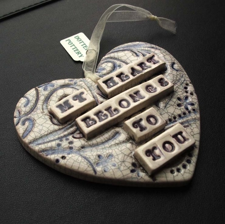 This ceramic heart is made from white earthenware clay and decorated with the words, My Heart Belongs to You. It has a purpl swirly background finished off with a crackle glaze for a shabby chic look.