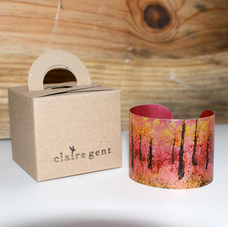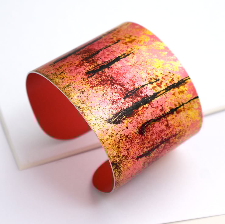A hand painted aluminium cuff in yellow, orange and black with a dyed red back. The cuff comes in a gift box as shown in the image.