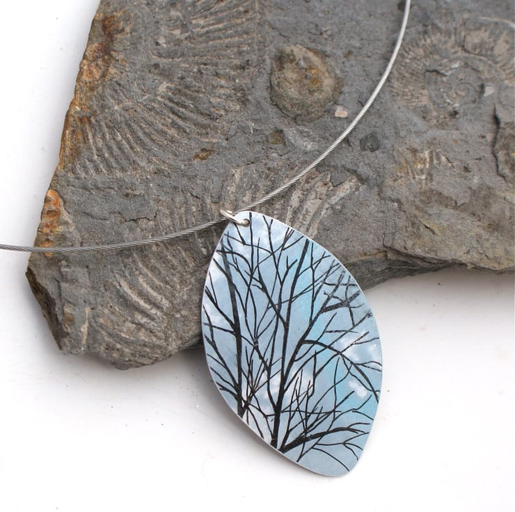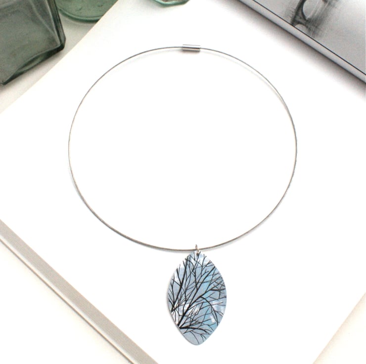 A pale blue and grey leaf shaped pendant with a black branch silhouette, hung from a grey coloured wire choker.