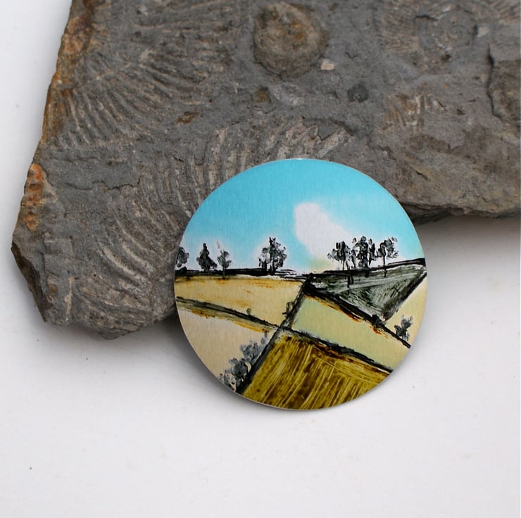 A disc shaped aluminium brooch, hand painted with a landscape of fields and hand dyed in turquoise.