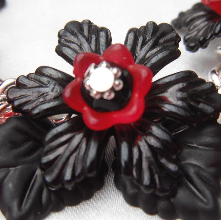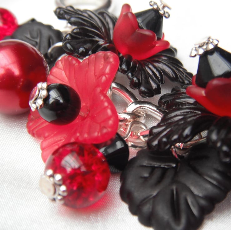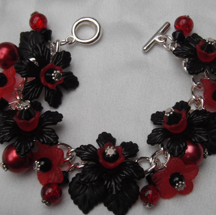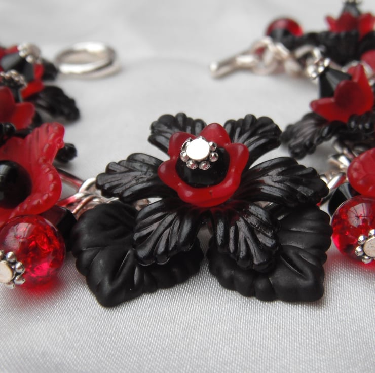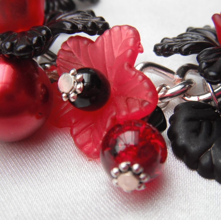 This is a lovely chunky curb chain charm bracelet, made with beautiful red and black lucite flowers and leaves, red crackle beads and black bicone beads. Finished with a silver plated toggle clasp.
